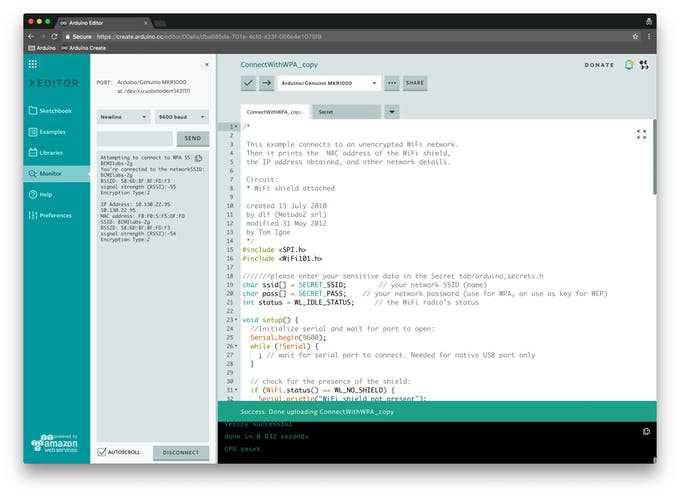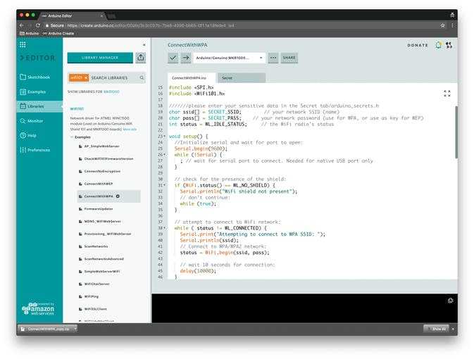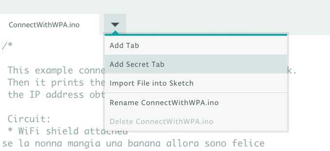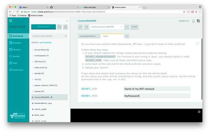 . If you now click on the tab called “Secret,” you will notice some input fields where you can fill in your data.If you have a MKR1000 lying around, you can upload this sketch on it and watch your board connect to Internet (just make sure you join a 2GHz WiFi network).