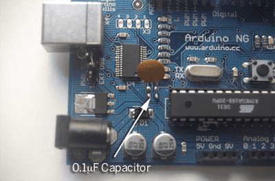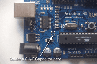 If you have an Arduino NG and you're envious of all the seconds saved by those Diecimila owners who don't have to press the reset button anymore, this page is for you. You can upgrade an Arduino NG to take advantage of the auto-reset functionality in Arduino 0009 and beyond with just a 0.1uF capacitor and a soldering iron.