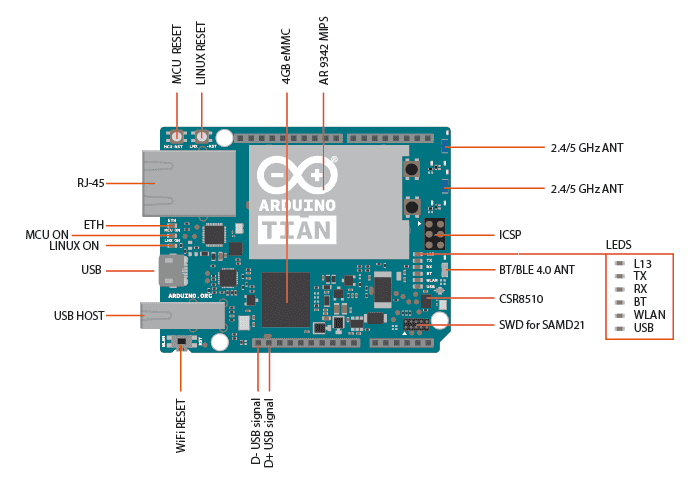 • Also the Wifi module is different. The Arduino Tian has IEEE802.11n 2x2 2.4/5 GHz dualband.