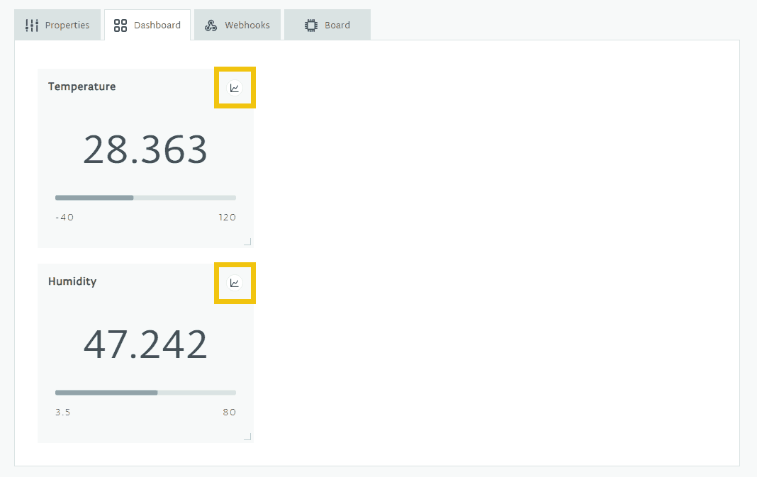 In this example, you are sending data from the board to the Arduino Cloud and graphing it using the widgets on the Cloud's dashboard. By adding the properties to the Thing as described earlier in this experiment, you will have enabled them to be graphed almost automagically.