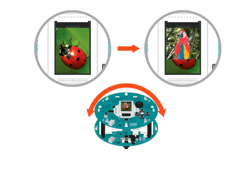 You can make your own gallery/picture show with help of the Robot. Put some pictures in the SD card, start the sketch, and you can see them showing up on the LCD. Use left and right button on the D-pad to go the previous or next image. Press up or down to enter the "tilt navigation" mode.