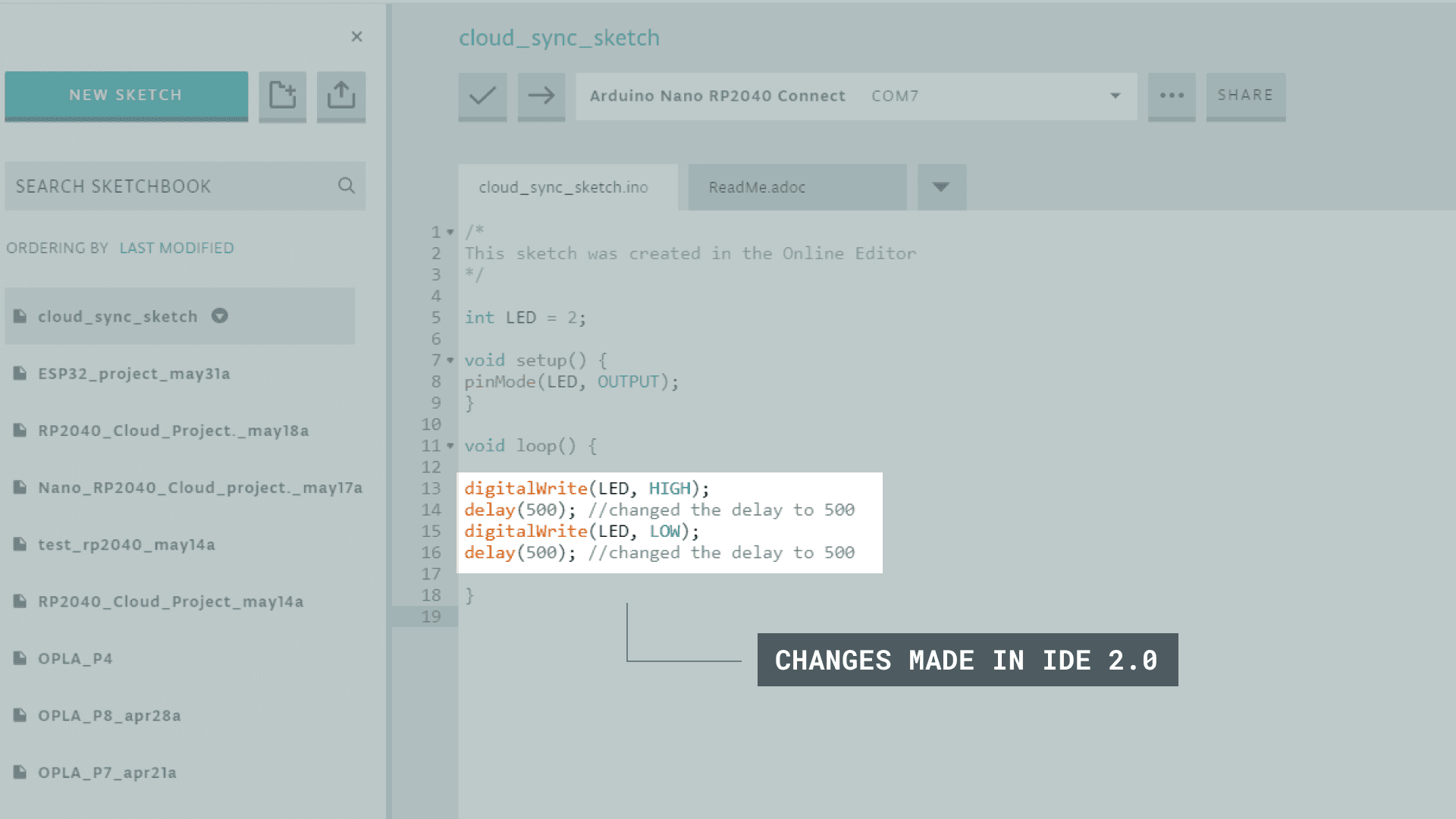 Code anywhere: Write your Arduino sketches on one computer and access them on another, with a single click! Do not worry about synchronisation or USB drives: the Arduino IDE 2 provides the Remote Sketches feature which allows you to store your sketches in the Arduino secure Cloud and retrieve them easily on any other workstation.