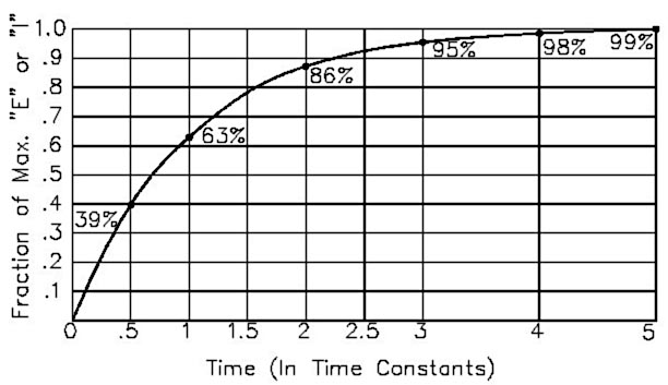 The voltage at 1 Time Constant equals 63.2% of the charging voltage.