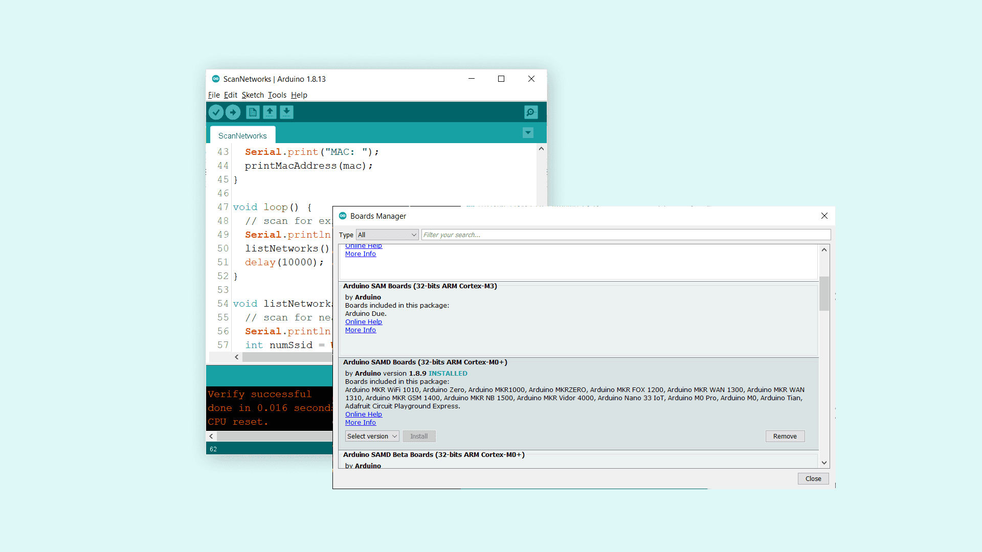 2. If we are using the offline editor, we need to make sure we have the drivers installed. In the editor, navigate to Tools > Board > Board Manager..., and install the Arduino SAMD boards (32-bits Arm® Cortex®-M0+) core.