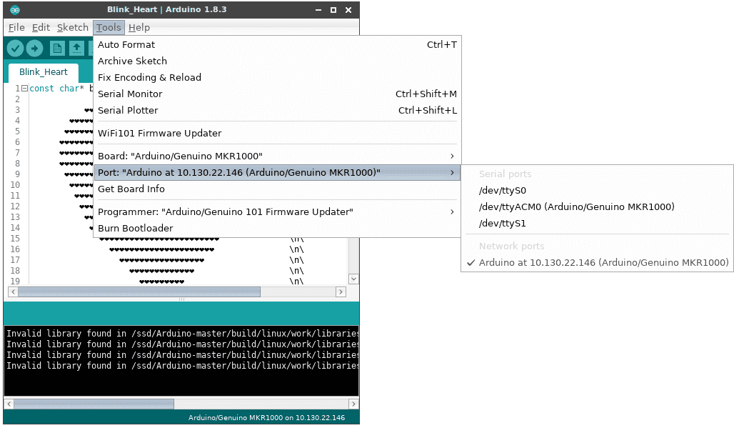 . If you forget about this you will lose the ability to upload over the air again (but you can still upload via serial, of course)We are now ready to upload our new sketch wirelessly! Select the correct Network port in the Ports menu and press "Upload"