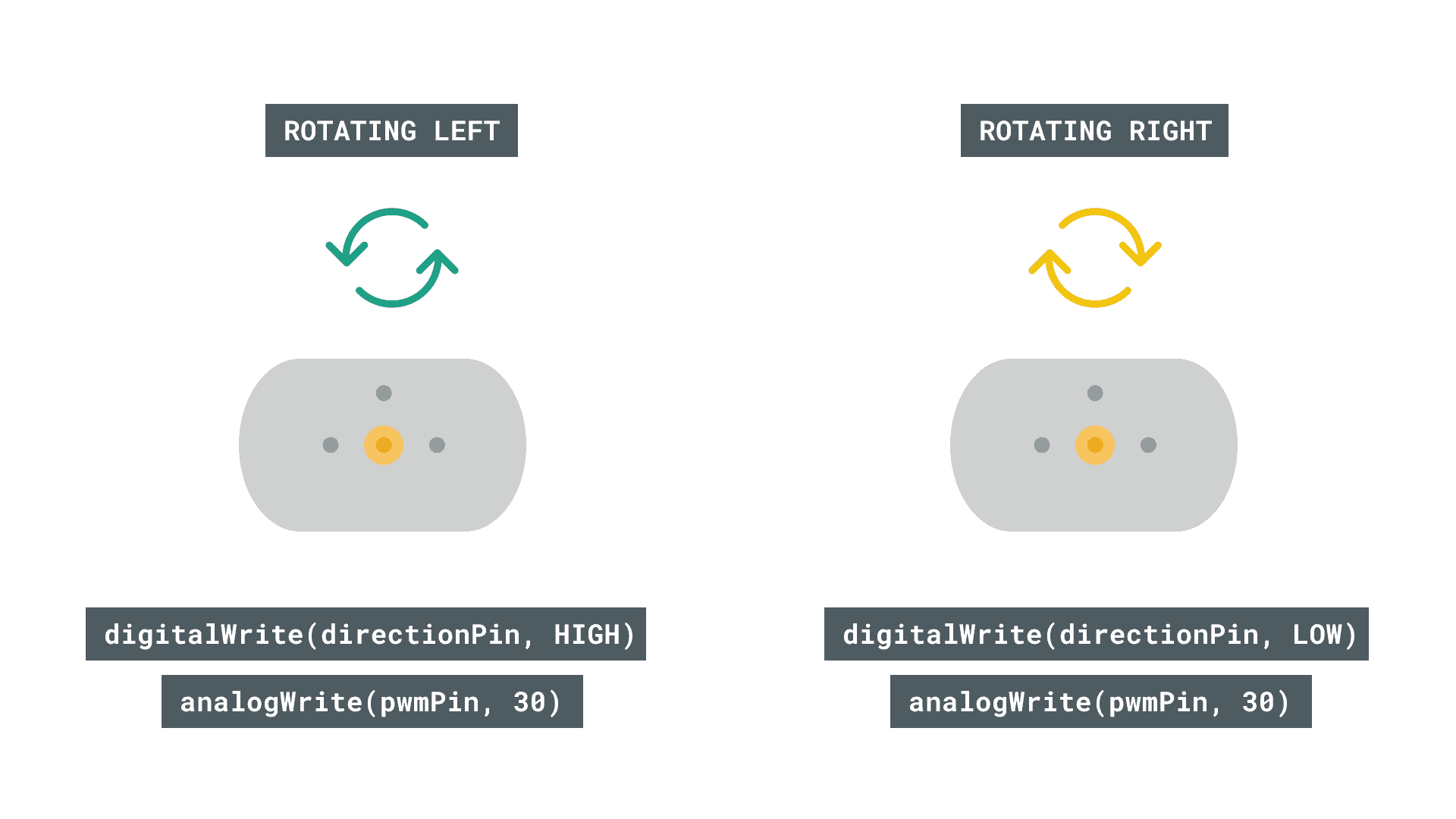 - sets the direction of the pin by using HIGH or LOW states.digitalWrite(directionPin, state)
