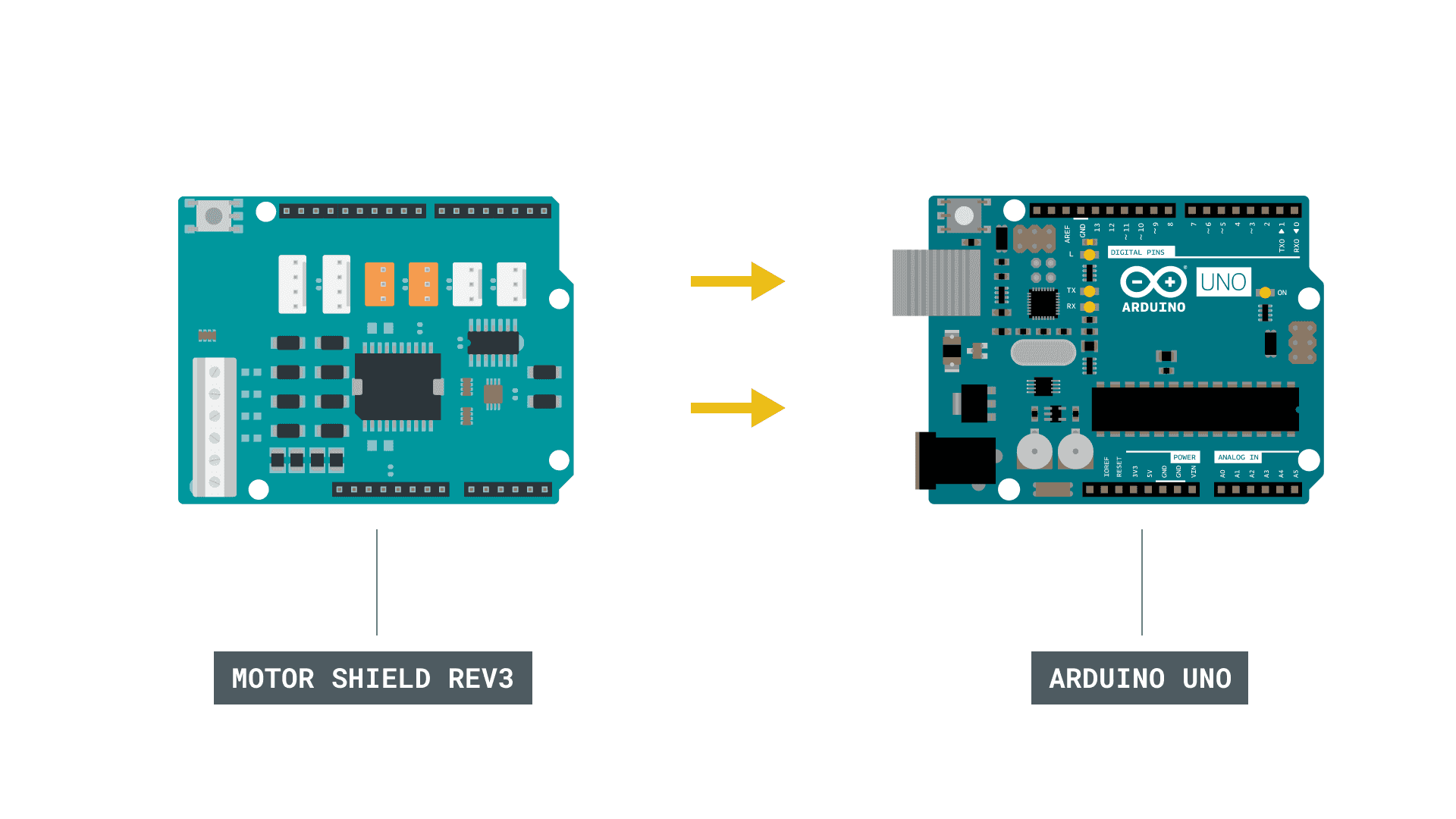Let's begin by mounting our Arduino Motor Shield Rev3 on top of an Arduino UNO.