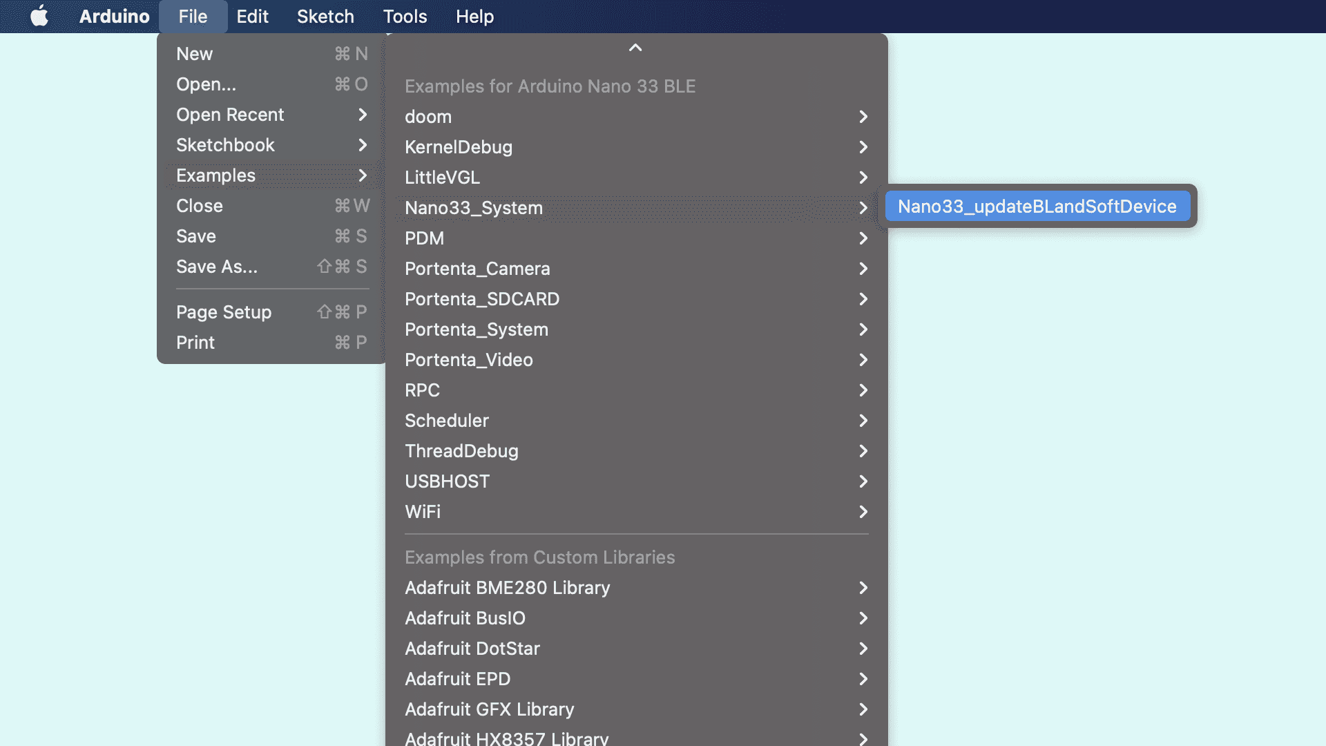Then, open: File>Examples>Nano33_System>Nano33_updateBLandSoftDevice