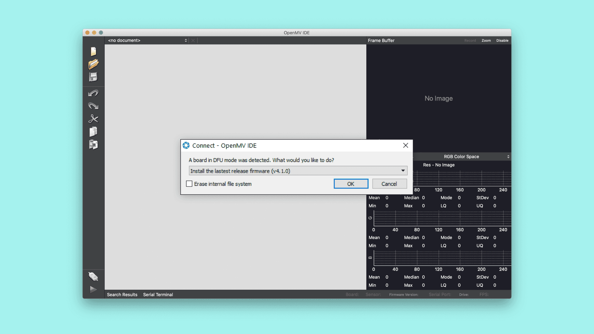 A pop-up will ask you how you would like to proceed "DFU bootloader(s) found. What would you like to do?". Select "Reset Firmware to Release Version". This will install the latest OpenMV firmware on the Nano. If it asks you whether it should erase the internal file system you can click "No".
