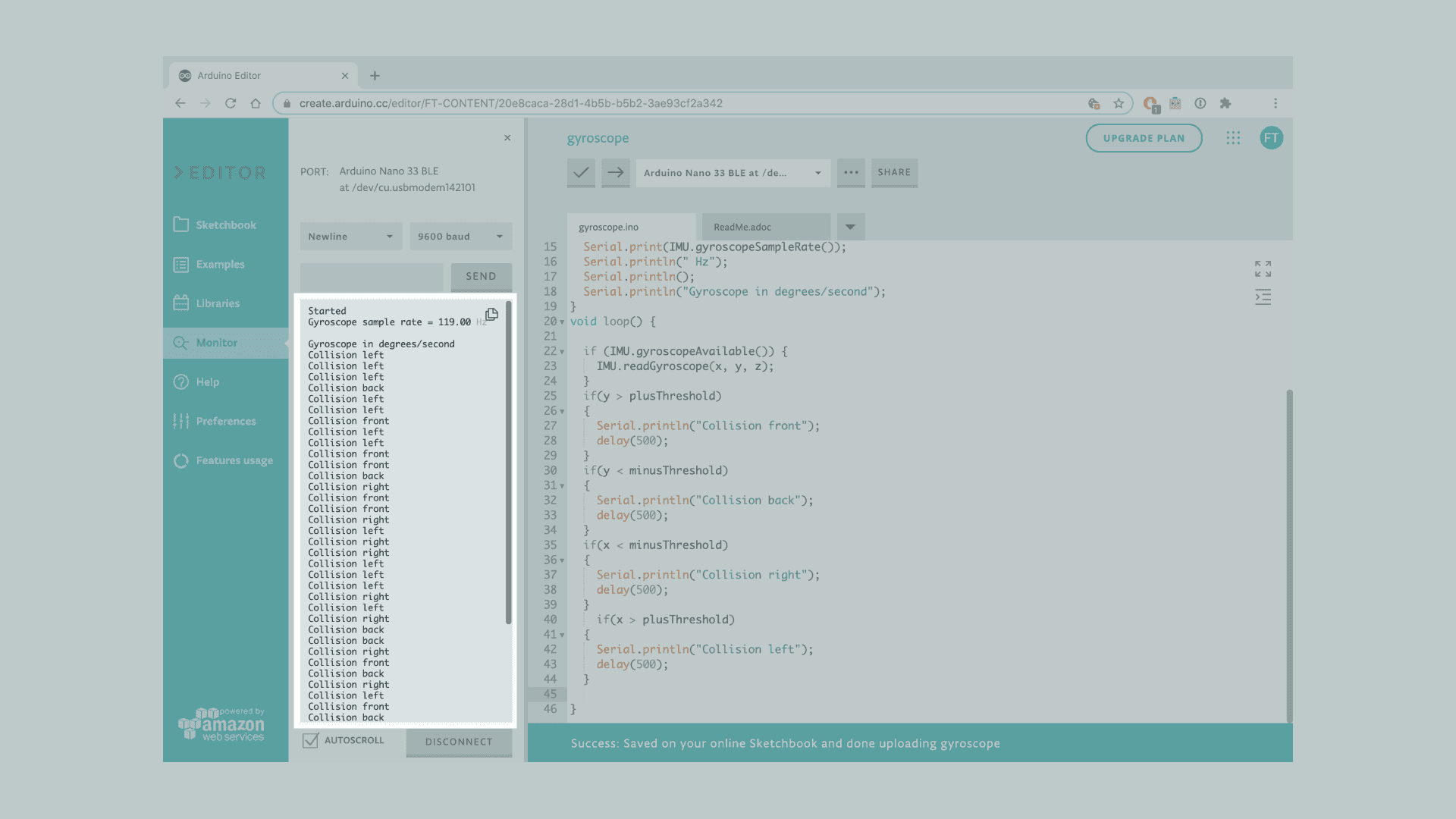This tutorial will focus on the 3-axis gyroscope sensor of the LSM9DS1 module, on the Arduino Nano 33 BLE Sense, in order to measure the direction of force on the board to emulate an object's crash. This will be achieved by utilizing the values of the gyroscope's axes and later print the return values through the Arduino IDE Serial Monitor.