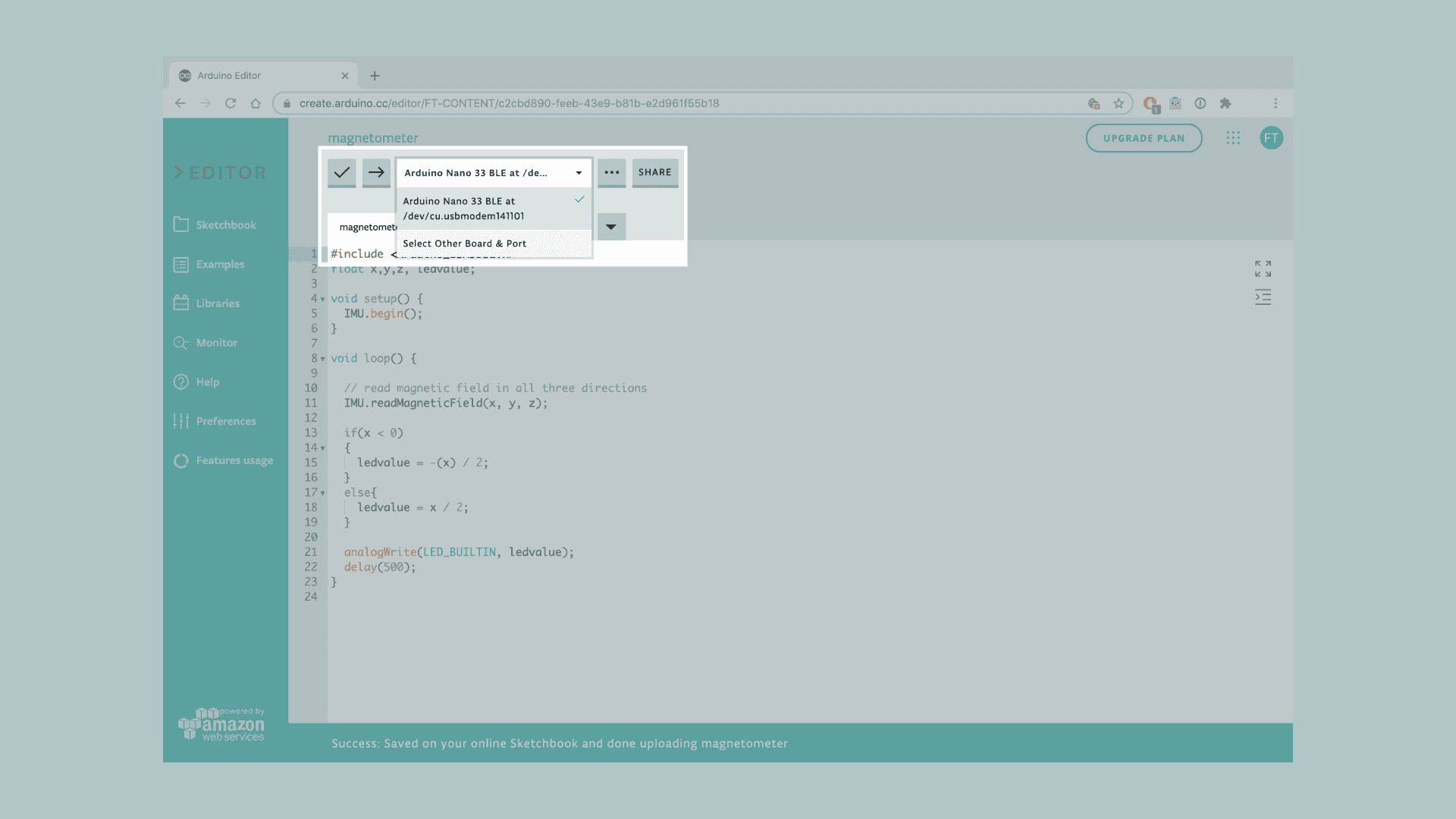 Next, connect the Arduino Nano 33 BLE to the computer and make sure that the Web Editor recognizes it. If so, the board and port should appear as shown in the image below. If they don't appear, follow the instructions to install the plugin that will allow the Editor to recognize your board.