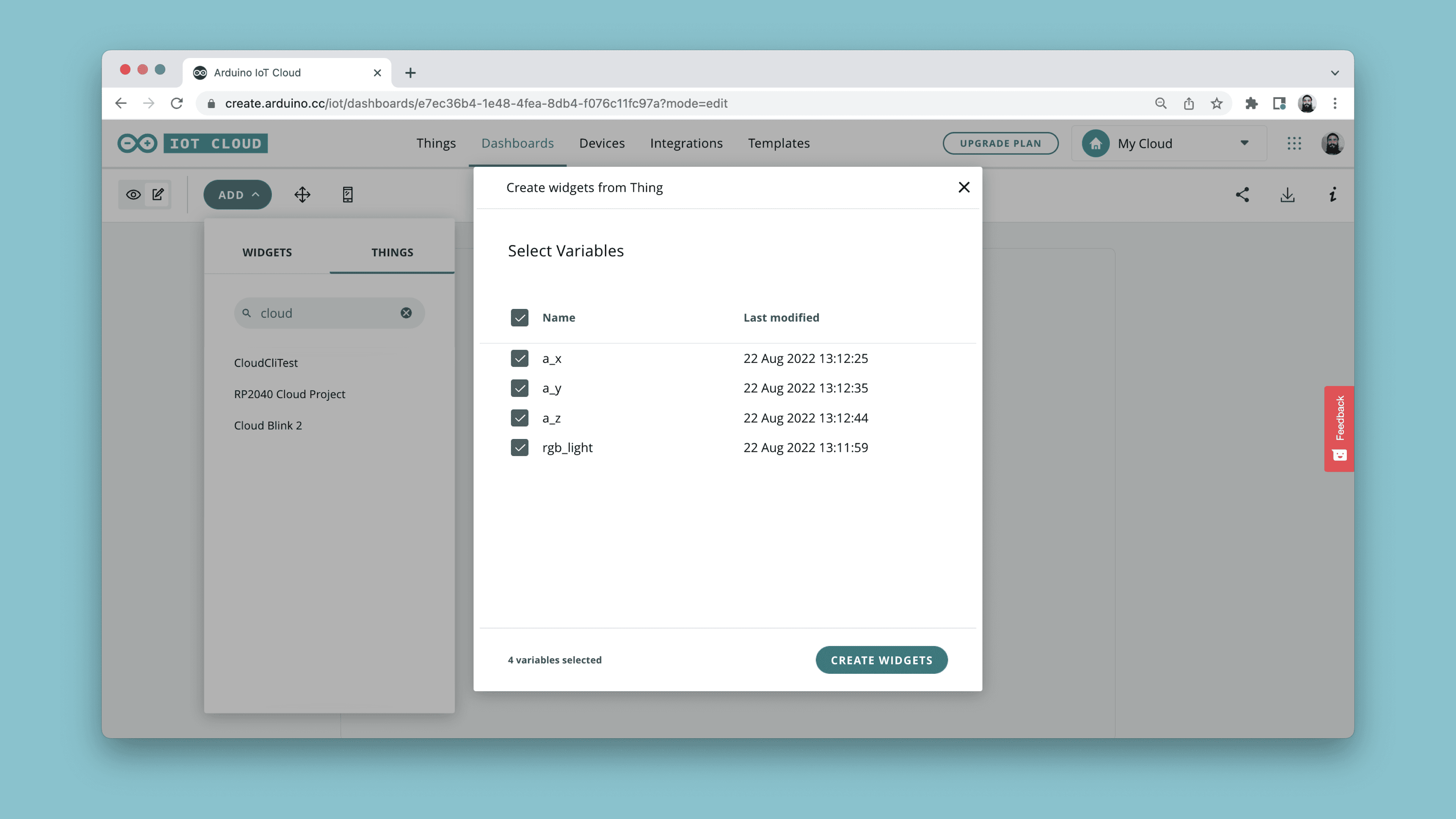 Now, click on the "ADD" button, then "Things", search and click on your Thing. You will now see a list of variables with a checkmark. Leave all marked, and click on the "Create Widgets button.