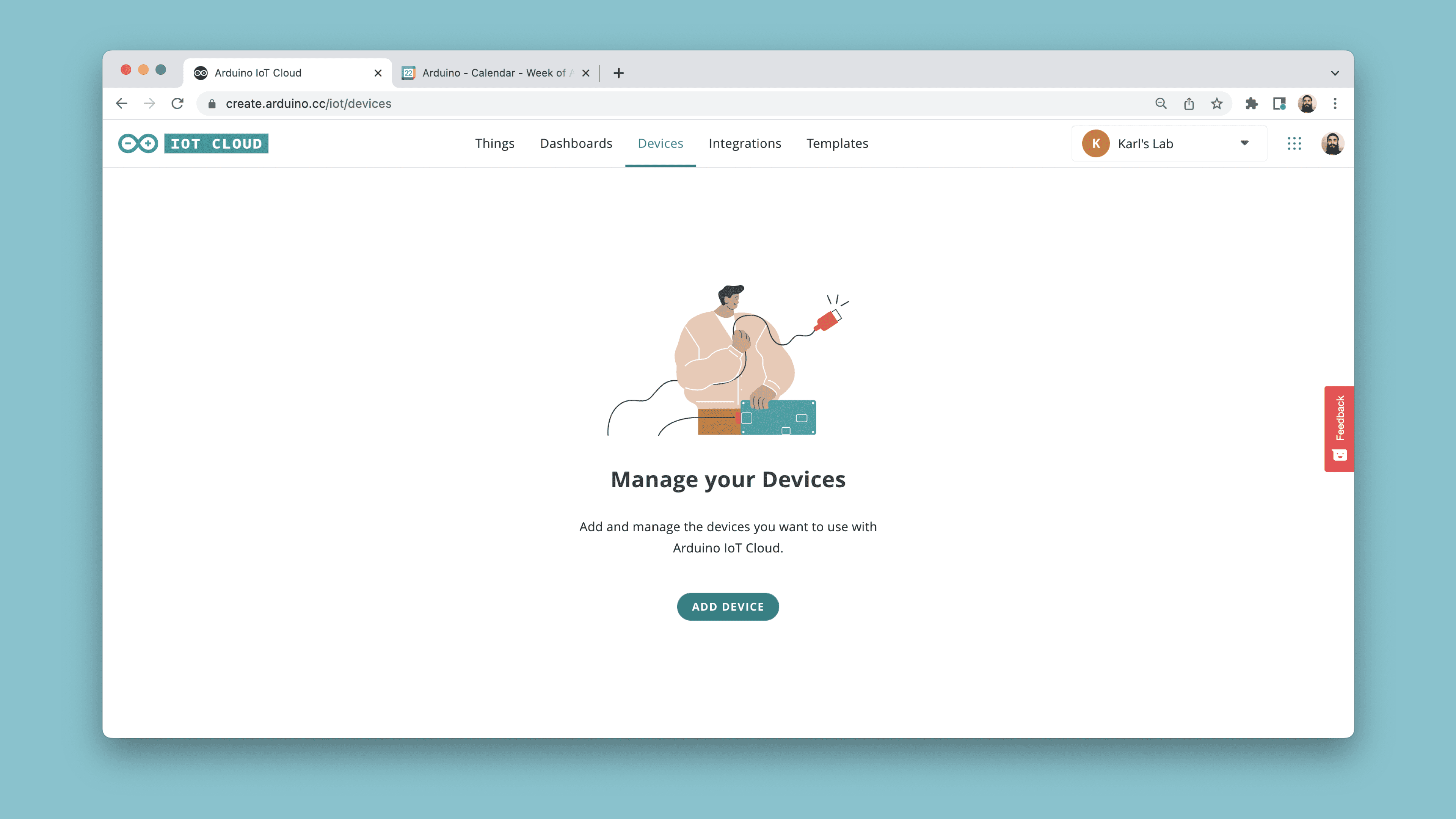 Once we are in the IoT Cloud, to configure our device, click on the "Devices" tab. Click on "Add Device" and follow the configuration to set up your board.