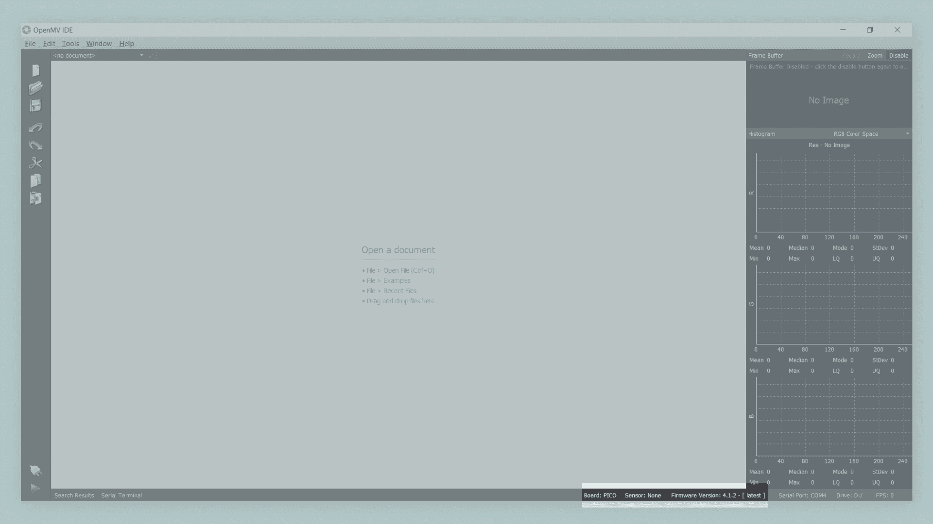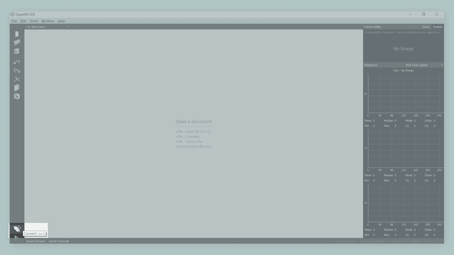 The "Connect" button should change now. When the board is connected, information about it should be displayed in the lower status bar. Make sure that the latest OpenMV firmware is uploaded to your board, you can check the latest OpenMV firmware release here.