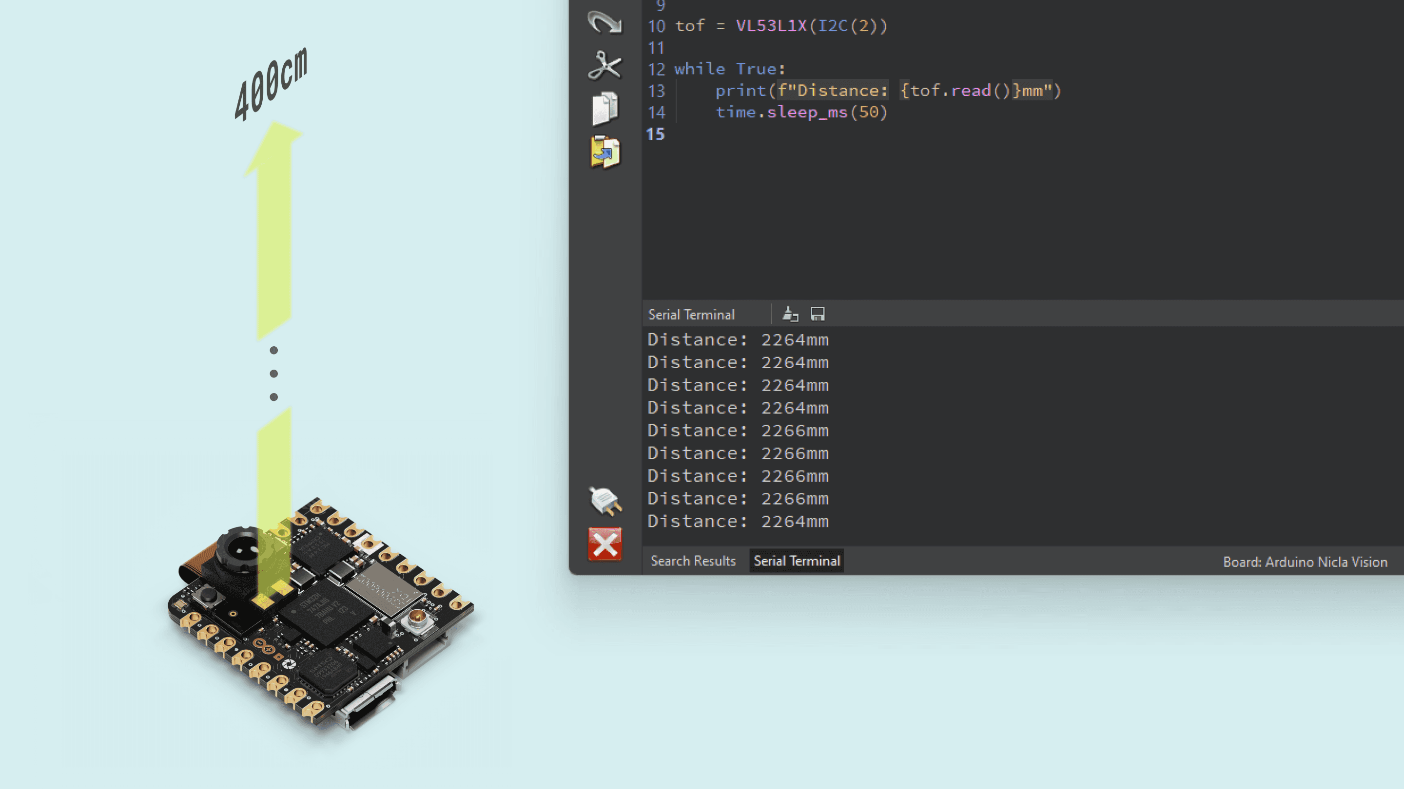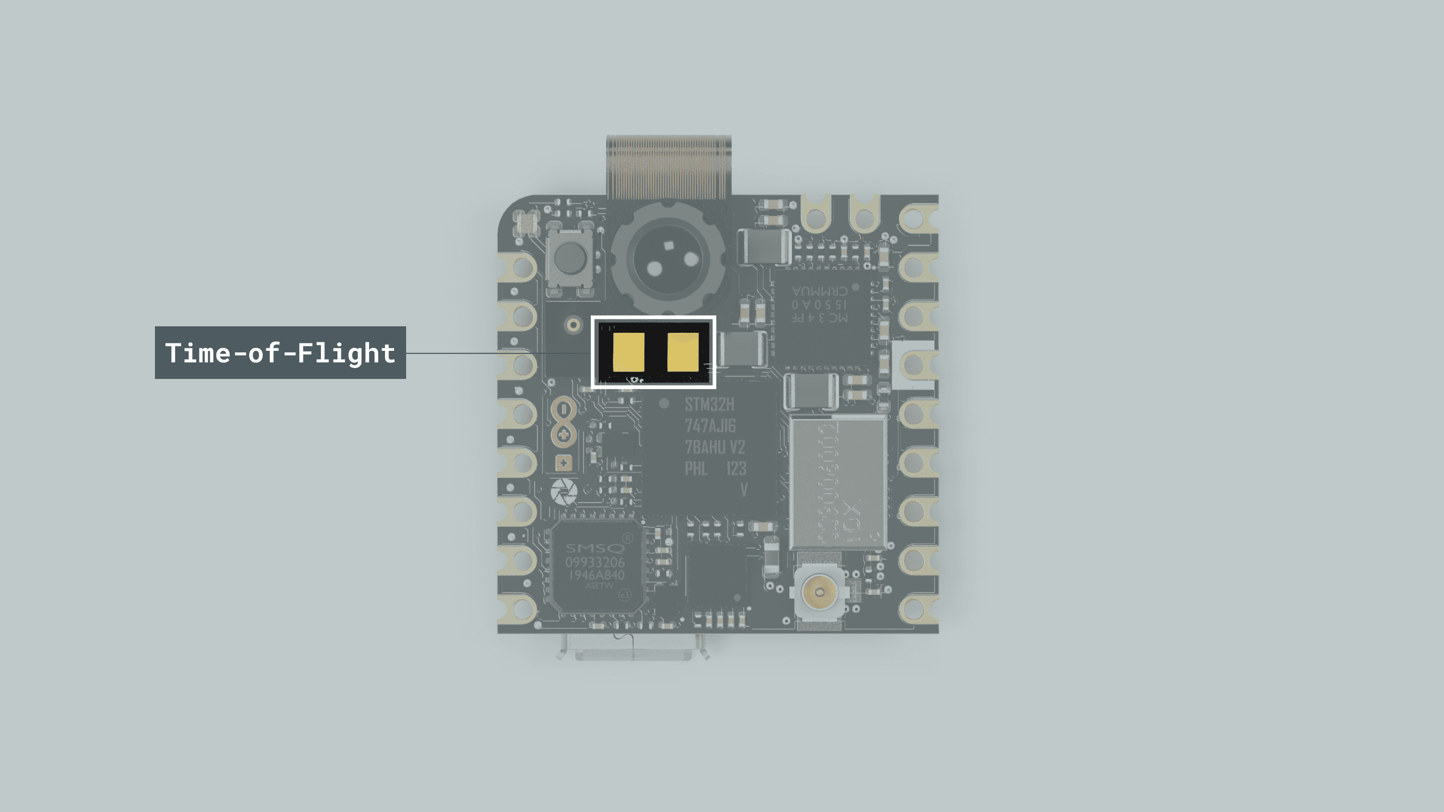 • Onboard distance sensor: the VL53L1CBV0FY Time-of-Flight sensor (U4) adds accurate and low-power ranging capabilities to the Nicla Vision. The invisible near infrared VCSEL laser (including the analog driver) is encapsulated together with receiving optics in an all-in-one small module located below the camera.