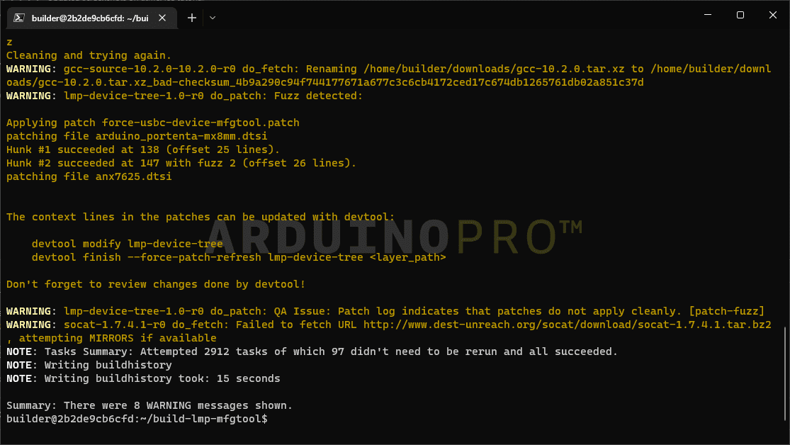 following the command sequence:1cd ..2DISTRO=lmp-mfgtool MACHINE=portenta-x8 . setup-environment3echo "ACCEPT_FSL_EULA = \"1\"" >> conf/local.conf4echo "MFGTOOL_FLASH_IMAGE = \"lmp-partner-arduino-image\"" >> conf/local.conf