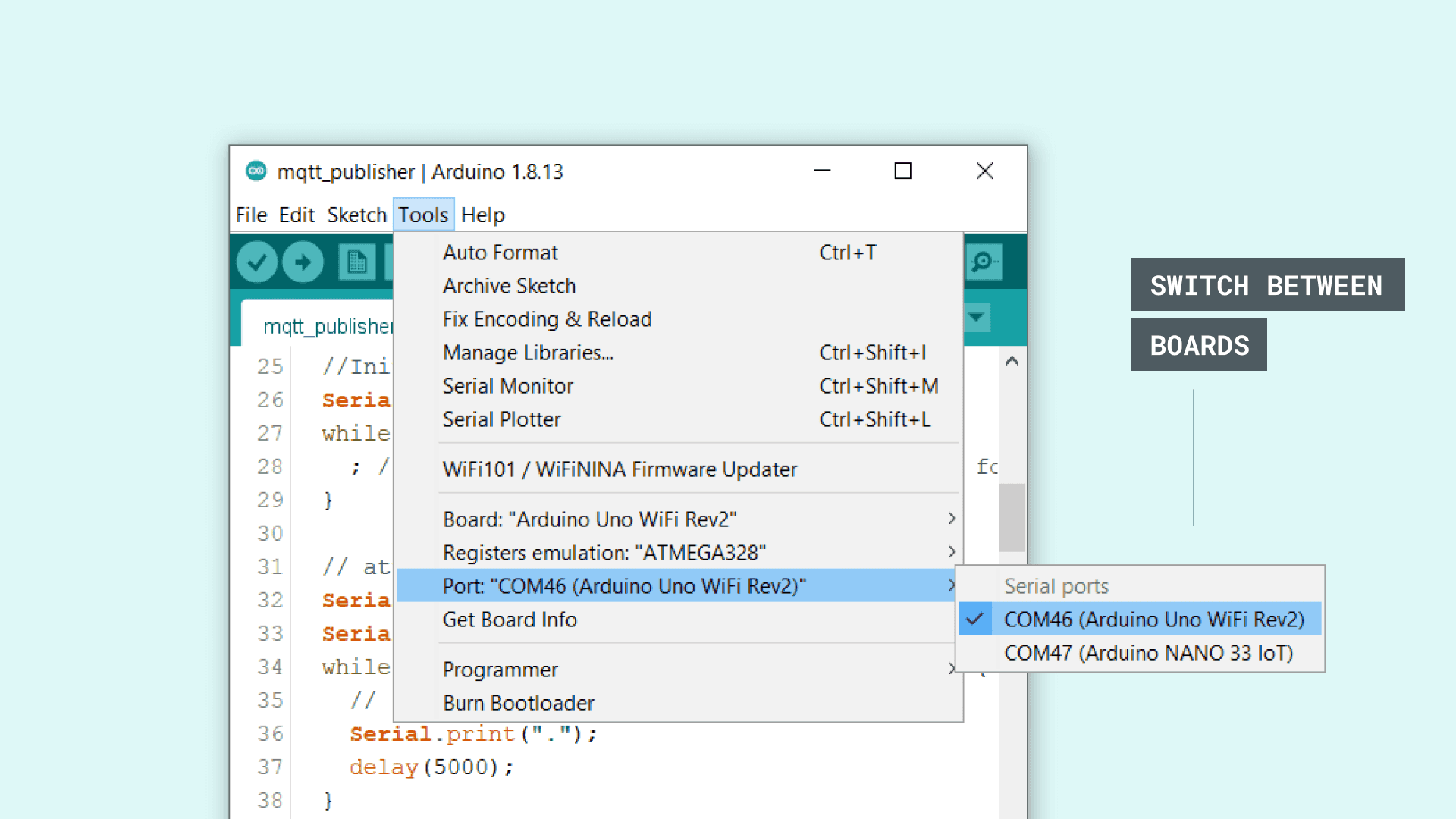 In this tutorial, a Arduino UNO WiFi Rev2 and a Nano 33 IoT board was used. When switching between the ports, we can see them listed as COM12 and COM3.