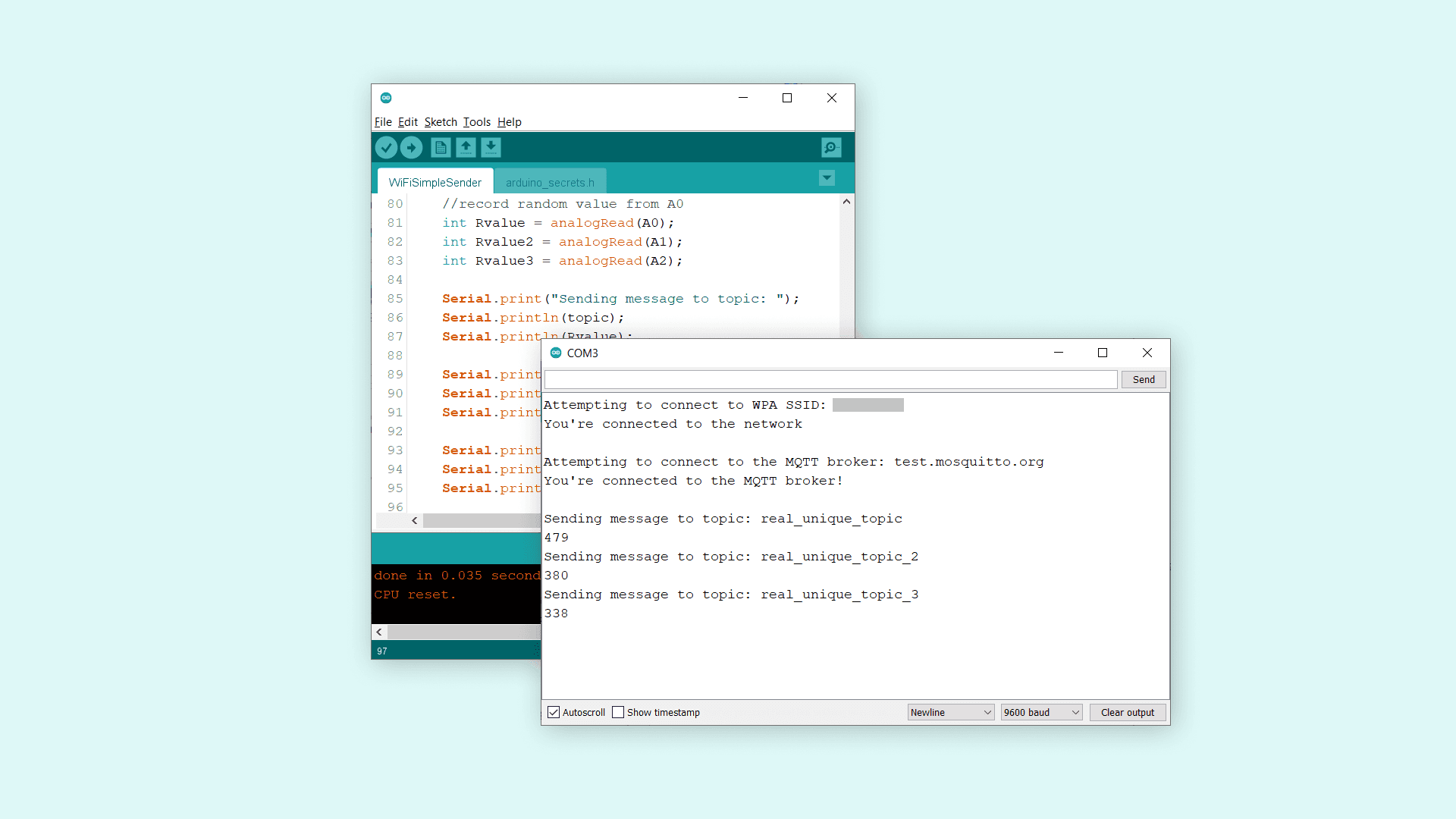 1#include <ArduinoMqttClient.h>2#include <WiFiNINA.h>3#include "arduino_secrets.h"4